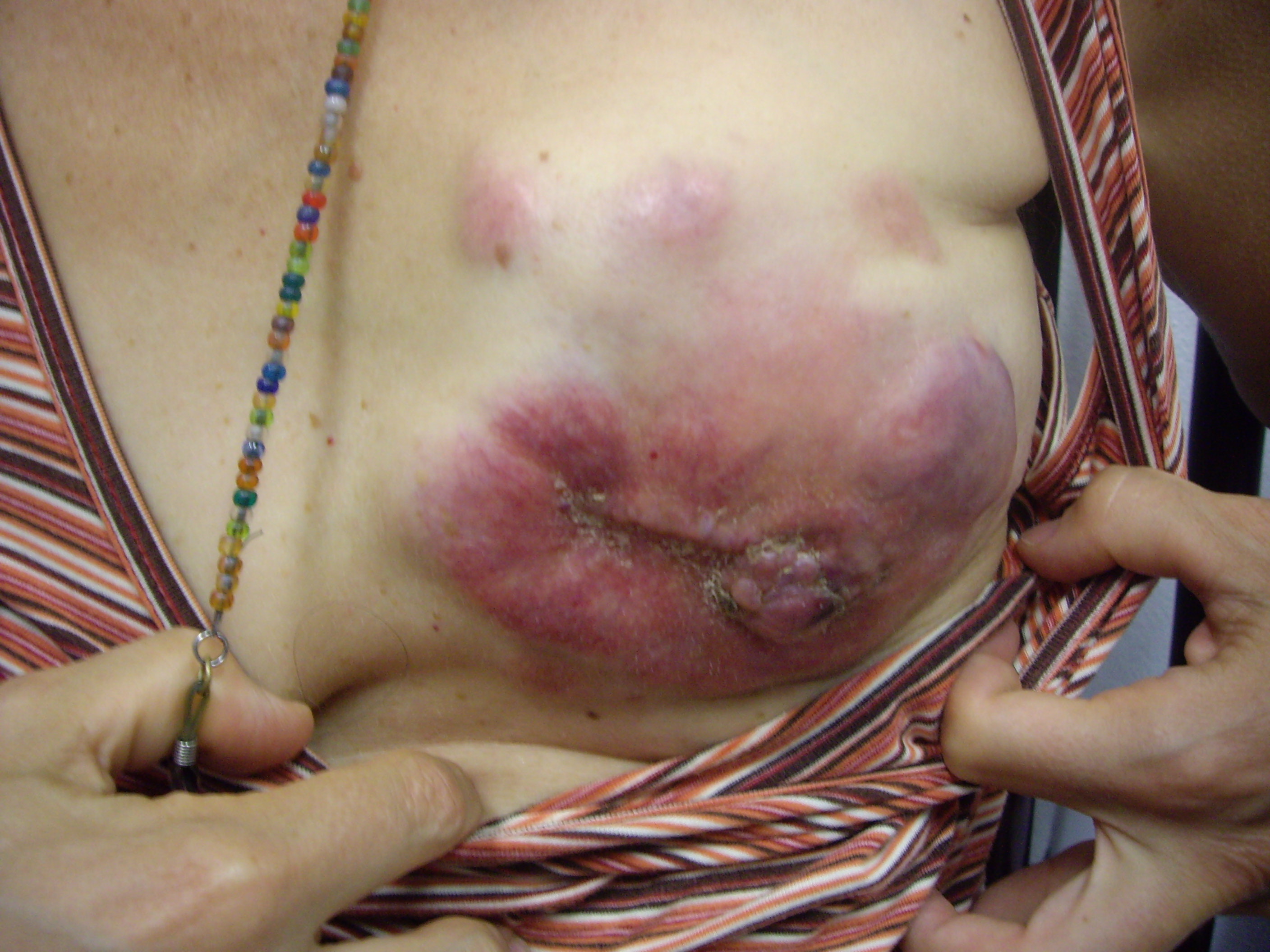 讀者先看這張照片中乳頭的位置,很明顯的可以看到開刀後的刀疤,其四周圍繞著許多紅色的硬塊,就是乳癌擴散的情形,以手按之,觸感非常堅硬如石,而且固定不動,狀若葡萄串一般,從發現有乳房硬塊至今,至少五年了,期間除了西醫先開刀之外,沒有做過其他任何的治療,查其寸口脈,得到弦脈,但是重按之則無附骨之脈,故知此癌症雖然已經擴散,但仍然在內臟之外,並無進入其內臟,詢問病人是否有熱感?答曰左側乳房到左肩位都極其炙熱,其他部位尚好,這是陽不入陰的陰實之症,由於五年來還是只在左側炙熱,所以我可以知道此際雖然癌症繼續在擴散,但是還只有一半,也沒有進入內臟,如果這種炙熱感遍及上半胸時,造成上半身是熱的,下半身是冷的時候,就會非常危險,於此之時,我當只有盡力一搏,07月28日開立的處方當可立即到達病灶之處,就算陰實沒有被打開,我還是能做到延長其壽命的,此人將於一週後回診,到時再看看結果如何?