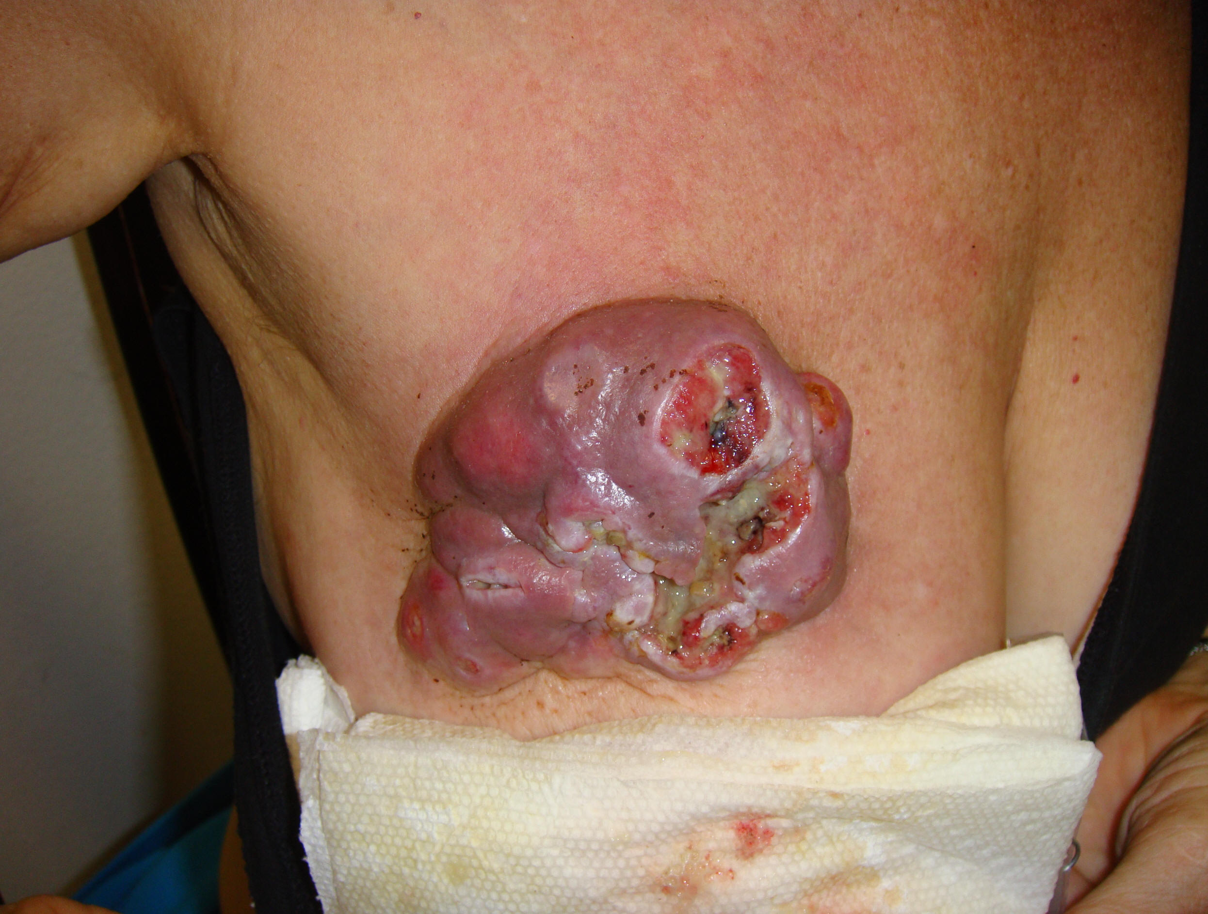 一位美國的中年婦女,住在邁阿密,去年曾經來找過我,她因為在2005年就得到乳癌,當時她堅持要採用她所謂的自然療法,所以她沒有接受開刀與化療等等,她當時來的目地是要我給她保持體力的中藥而已,於是我只給她六味地黃丸,週五來時自述在幾個月前做出一個非常錯誤的決定,就是聽信西醫的話,服用一種叫做Avastim,結果服用二個月後,左乳房中的腫塊迅速擴大,而且又長出一新的腫瘤在左乳上,同時乳房腫瘤變得非常硬,當時她露出已經破口塌陷的左乳給大家看,我拍了張照片給讀者參考,雖然氣味很臭,但是病人完全沒有疼痛,只有被切除乳房的病人才會有劇痛現像,病人有自己的權利,要開刀做化療,或是任其自然發展,都由病人自己做決定,此人從得到乳癌至今,也已經超過四年了,如果沒有吃西藥的話,可能還不會擴散如此之快,西藥廠誇大西藥的療效,等於是拿病人來當實驗品,真是惡魔的行為。