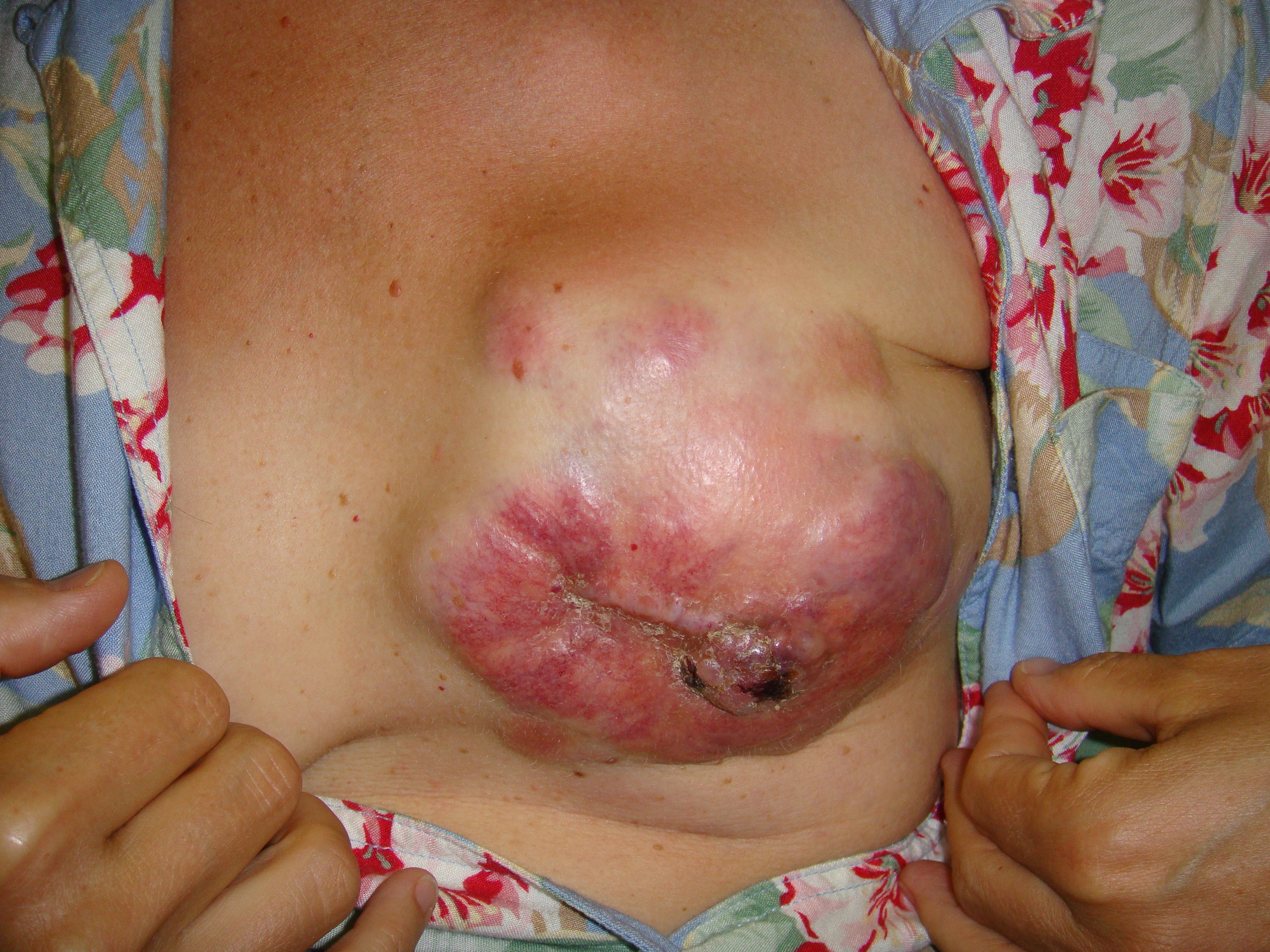 今年這次暑假的跟診訓練,好像是專門訓練如何治療乳癌的集訓般,接連來了好幾位的乳癌患者,有輕的也有重症,今天來的這位乳癌患者是位重症患者,上週來過一次,我有簡述在前篇日誌中,經過一週的服藥後,她的症狀就已經改變了許多,下面是今天拍下的照片 ,表面看時顏色從原先的深紅色已經變為鮮紅色了。
