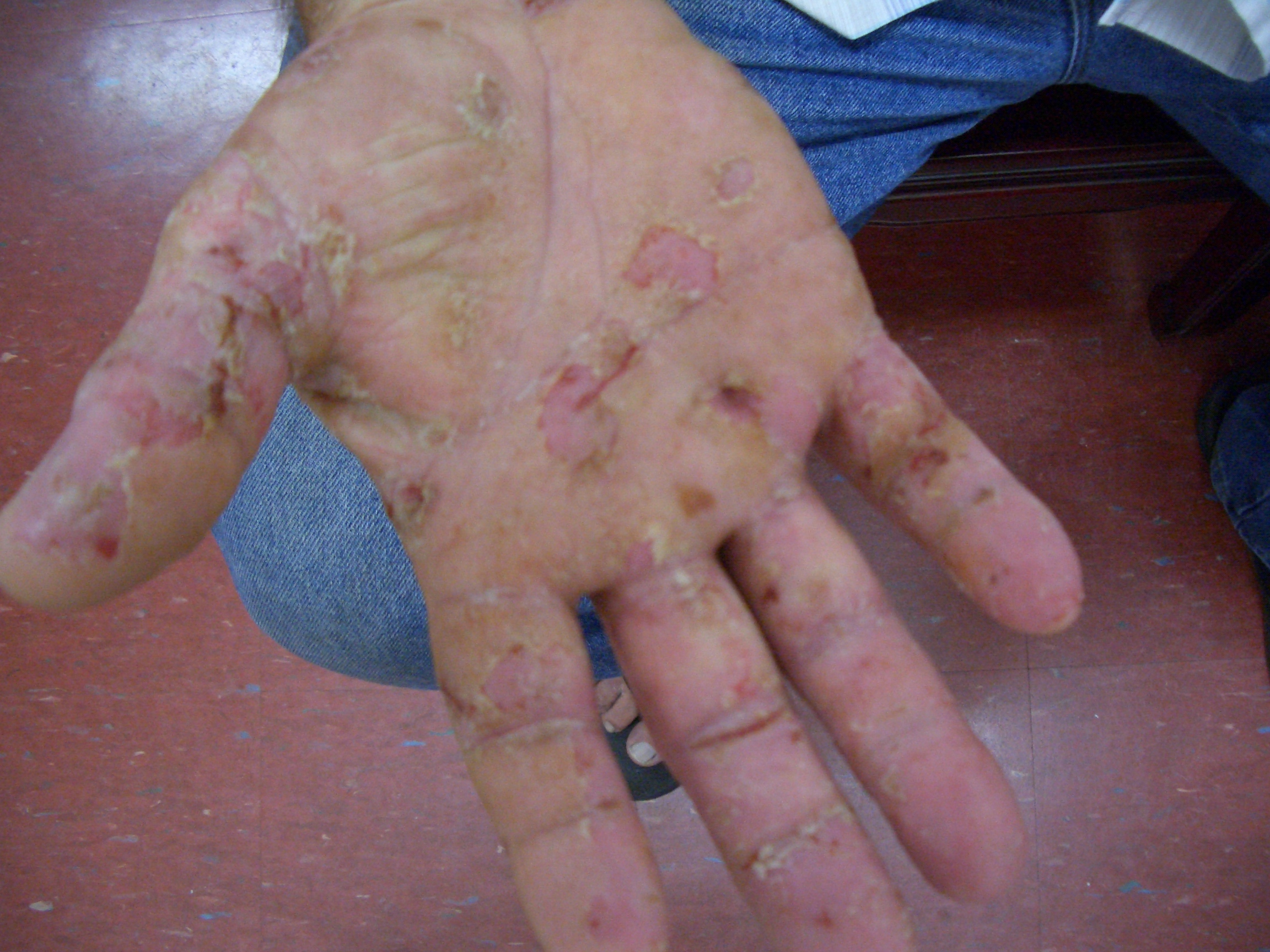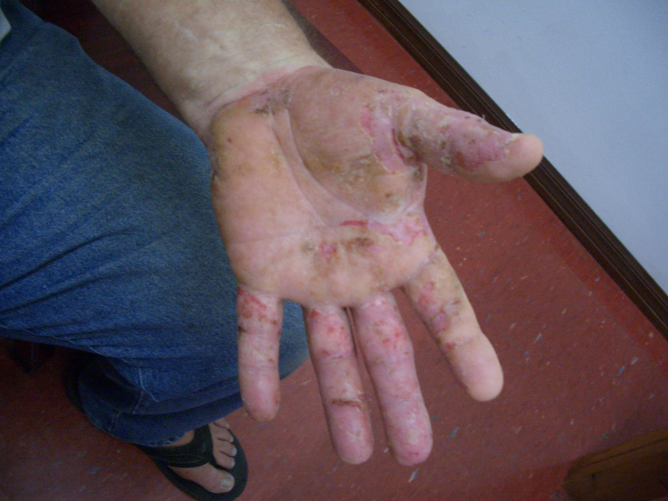 一位病患手掌潰爛約一個月,於上週來診,因為太忙我沒有時間寫下此案例,但是我有將之拍照下來,今天來複診,手掌皮膚已經好轉許多,初診時自述手掌皮膚非常癢,因此抓到皮膚都潰爛化膿,但是癢卻依然故我,絲毫不變,我ㄧ看便知這是血中有毒素,手掌為心包與心經所過,諸癢來自肝臟,肝藏血,心生血,我選用心包經的間使穴,加合谷,曲池,當時手掌癢就停止了外用漢唐紅來收潰爛的瘡口,內服中藥解毒劑(隱藏處方),今天來時說上次針後加上服藥與外用粉劑,效果非常好,但是昨天跟今天就比較差些,我ㄧ看病例記載,原來是我給他的藥只有五天量,所以他有兩天沒有藥,因此如此,於是我使用同樣治療方式藥物增加到足夠吃二週的量,這種病不多見,但是當一位中醫師,必須隨時能替病人解決些疑難雜症,就算遇到沒有看過的病時你只要病理理論很強,就可以隨時創造處方出來,隨時可以做出最正確的診斷。