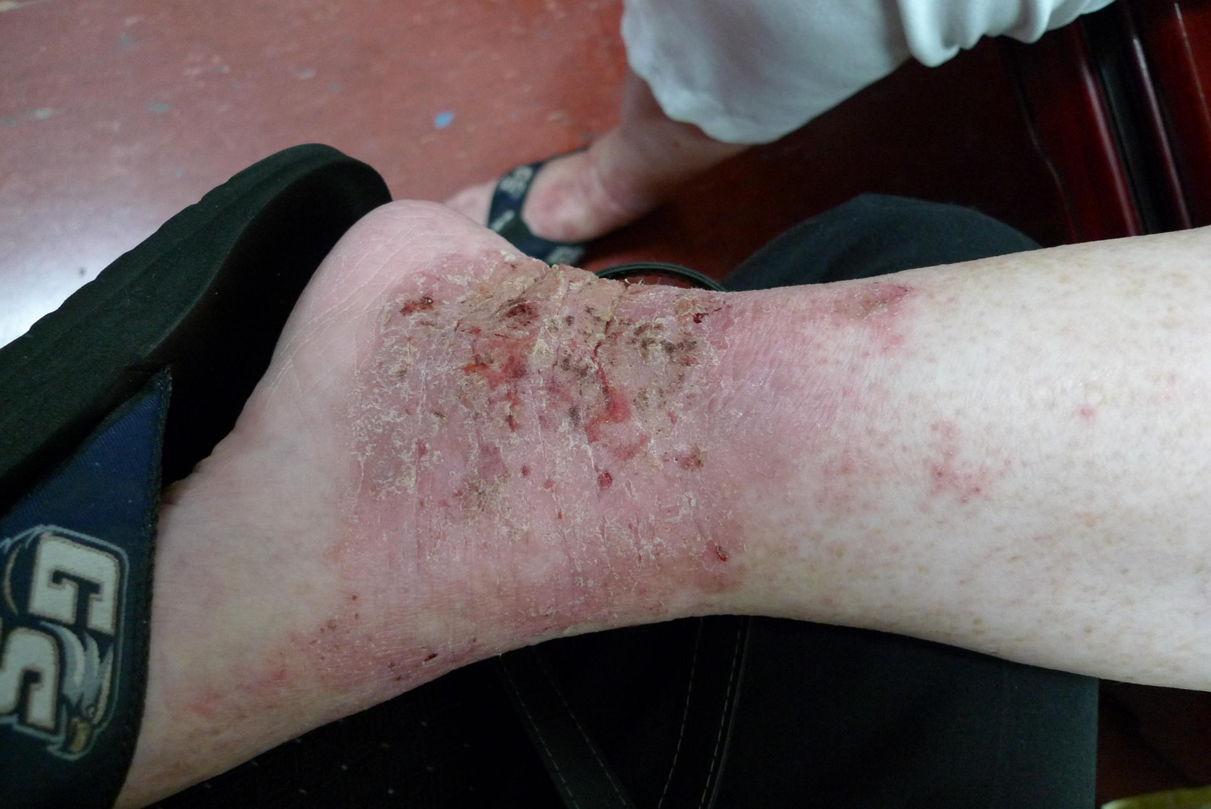 下面的照片就是她的皮膚狀況,現在是無人知道這是什麼病?讀者光是看到這照片,我想就已經知道病人必然十分痛苦,發紅的皮膚又痛又癢,十年來持續如此從未好過,這種皮膚病有可能是來自在醫院中使用的化學藥劑造成的,也有可能是她隨著軍隊走,駐防在某國某處而染上些無名病毒之類,處方已經開給她了,看看一週後的反應如何?