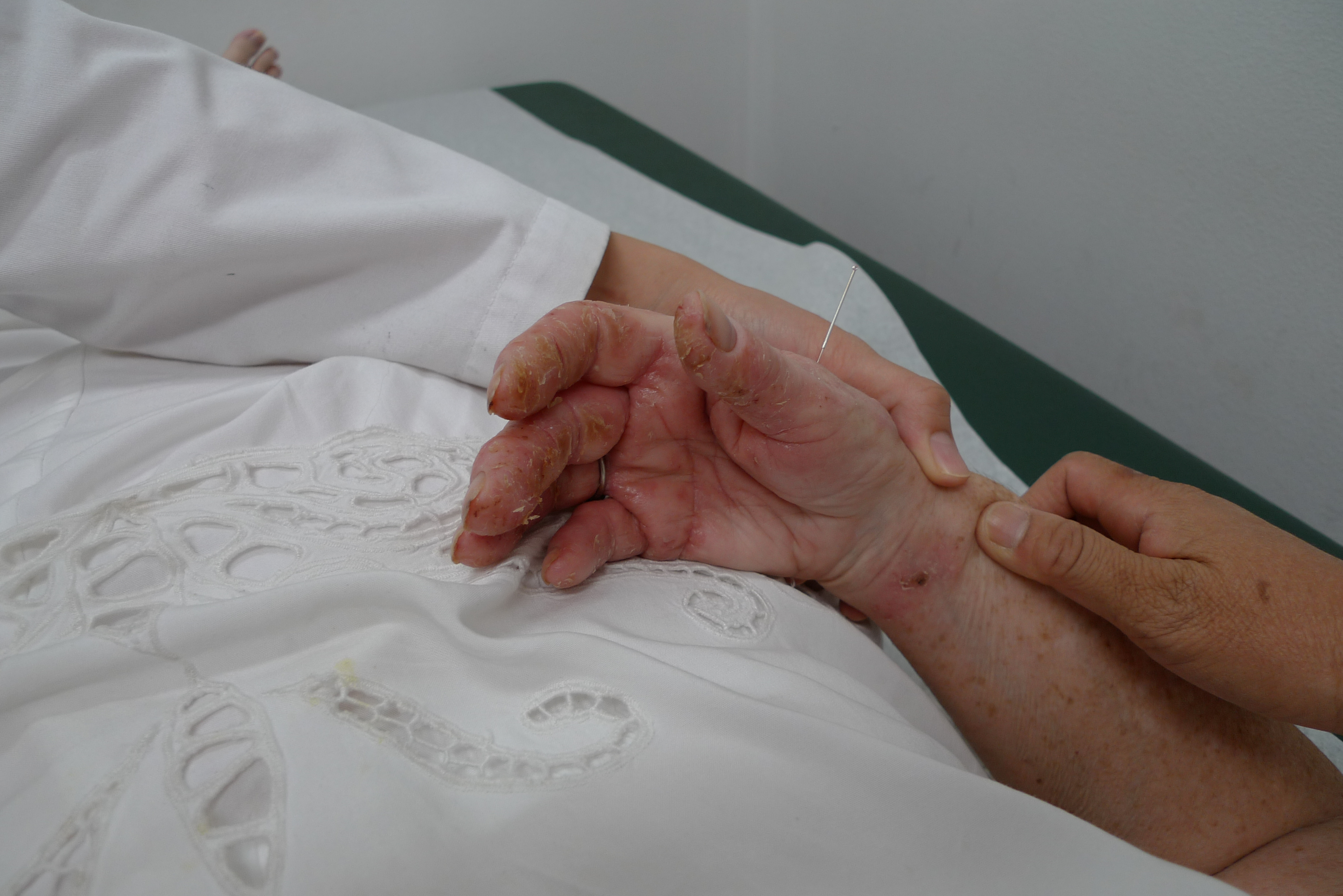 那位皮膚病的軍隊護士今日再做針灸療程,她的皮膚自從停止做雷射治療,專心使用中藥與針灸治療後,現在開始急速的產生變化,尤其雙手掌的皮膚到今天來時已經可以看到粉紅色的嫩皮出現,幾乎快要回復正常了,只有腳踝地方的皮膚仍有問題,但是皮膚也逐漸從外圍開始變乾蛻皮中,她自述多年以來都從來沒有這樣好過了,她想想經過那麼多年的無效治療,結果中醫接手治療後才幾週而已,病情就迅速好轉,真是令她很感慨。下面是她今天的照片。