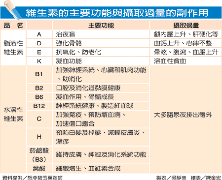 她說,在考慮自己需不需要補充維生素之前,首先該考慮是否有均衡飲食,現代人生活忙碌,很容易忽略某些食物,或常食用垃圾食物,每天補充一顆綜合維他命應該就夠了。攝取過多的水溶性維生素雖然可以隨尿液排出體外,但攝取過多的脂溶性維生素,就會蓄積在肝臟中,可能造成中毒現象。(唯一須要修正的就是這裡